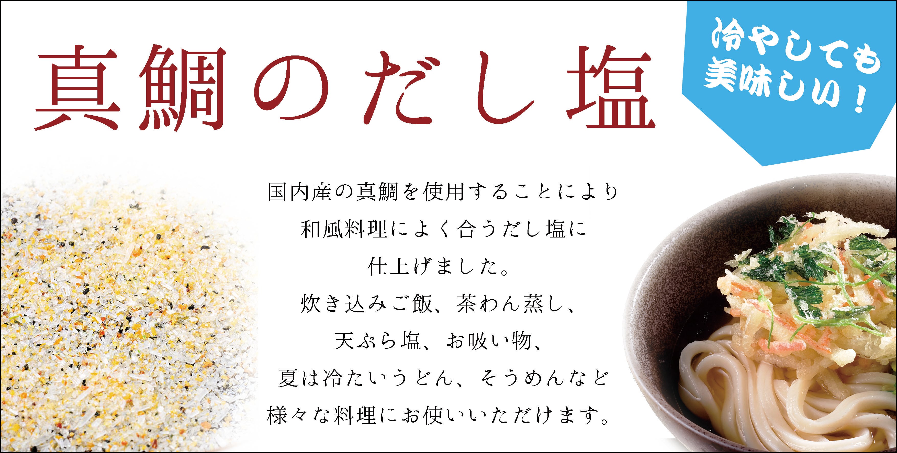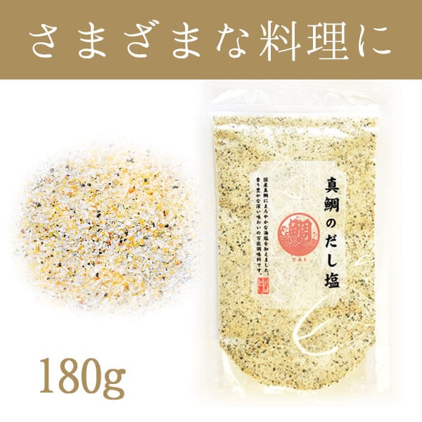 国内産の真鯛を使用した出汁塩です。炊き込みご飯、茶わん蒸し、天ぷら塩、お吸い物など、様々な料理にご使用いただけます。