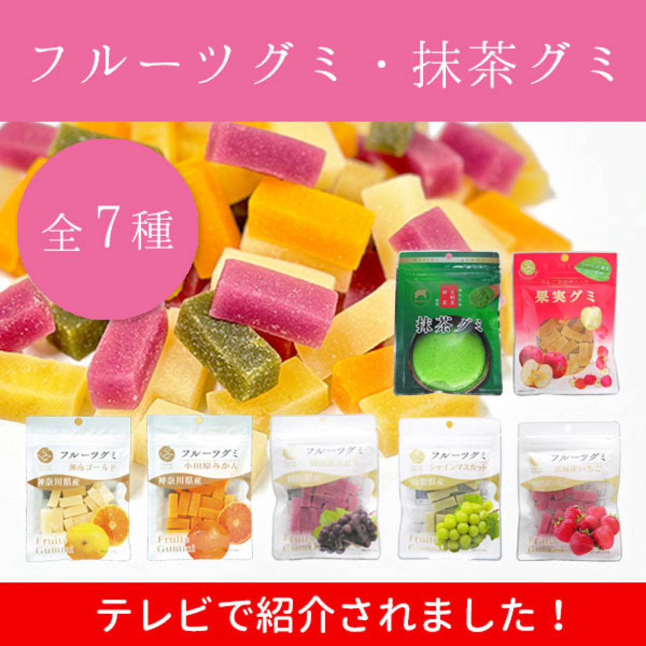 各県の名産フルーツ、抹茶を使用したグミです。